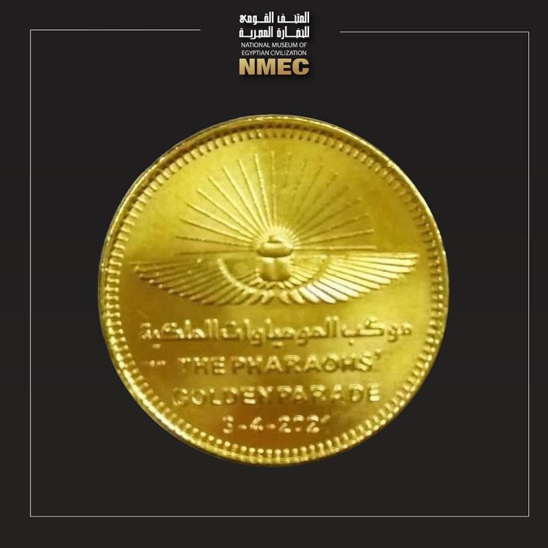 In commemoration of the “Pharaohs’ Golden Parade” where twenty-two royal mummies of Kings and Queens were transferred from the Egyptian Museum in Tahrir to the National Museum of Egyptian Civilization in Fustat, on April 3rd, 2021, the Ministry of Finance issued a commemorative silver coin of 100 L.E carrying the ceremony’s official logo in both English and Arabic, to document the exceptional event.